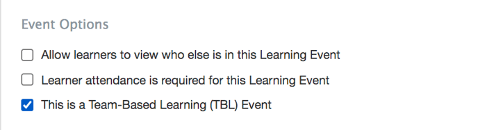 A learning event is required to run a TBL session and deliver the associated TBL exams. When creating a learning event for a TBL session, configure the TBL event as follows.