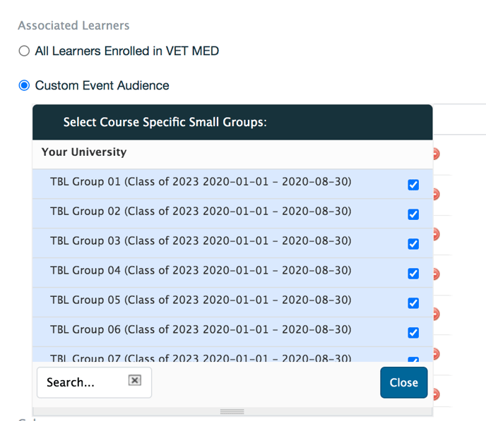 - Event Audience: When setting the event audience under the "Associated Learners" section you must select Custom Event Audience > Course Specific Small Groups and choose the appropriate course groups then click "Close". You must first have course groups configured in the course to be able to choose course groups at this step.