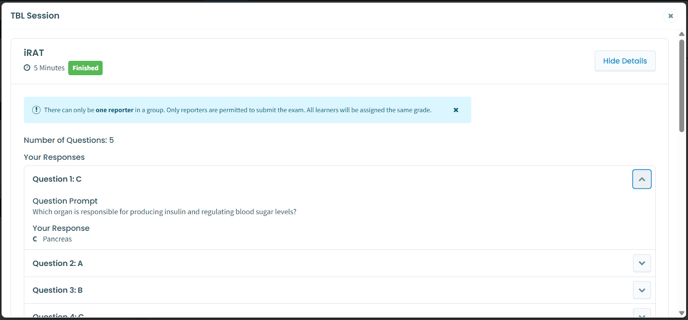 After submitting an exam, learners can view their completed RATs, labeled "Finished." To review their answers, they should click "More Details" for each exam that is completed and then click the chevron icon next to each question. The iRAT will show the question prompt and the learner’s response. The g/tRAT will show the group’s responses alongside their iRAT.